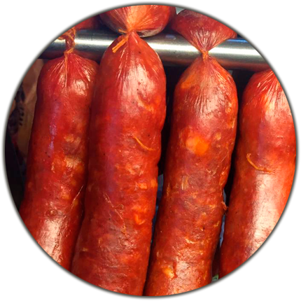 Elaboramos también el chorizo Español; un Chorizo elaborado con 100% carne de cerdo madurada y sazonado con condimentos importados de España que le dan ese sabor ibérico tradicional.
